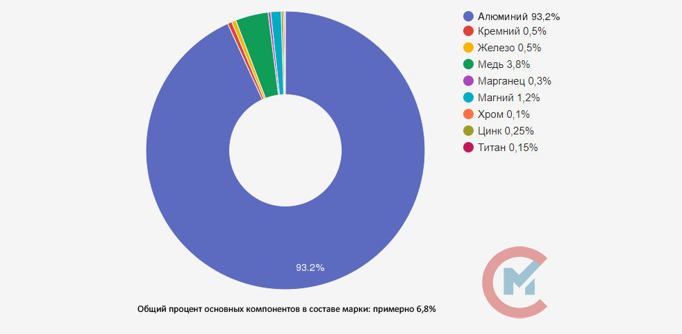 Д16 имеет в своем составе такие элементы, как медь (3,8-4,9 %), магний (1,2-1,8 %), марганец (0,3-0,9 %), железо, кремний (по 0,5 %), цинк (0,3 %), титан, никель (по 0,1 %). Благодаря данным добавкам, сплав обладает высокими механическими свойствами, антикоррозийностью и жаропрочностью.