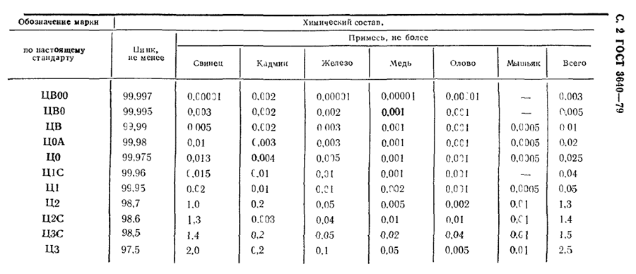 Согласно ГОСТ 3640-79 и ГОСТ 3640-94, общая доля нормируемых примесей в сплаве марки Ц1 должна составлять не более 0,05%.